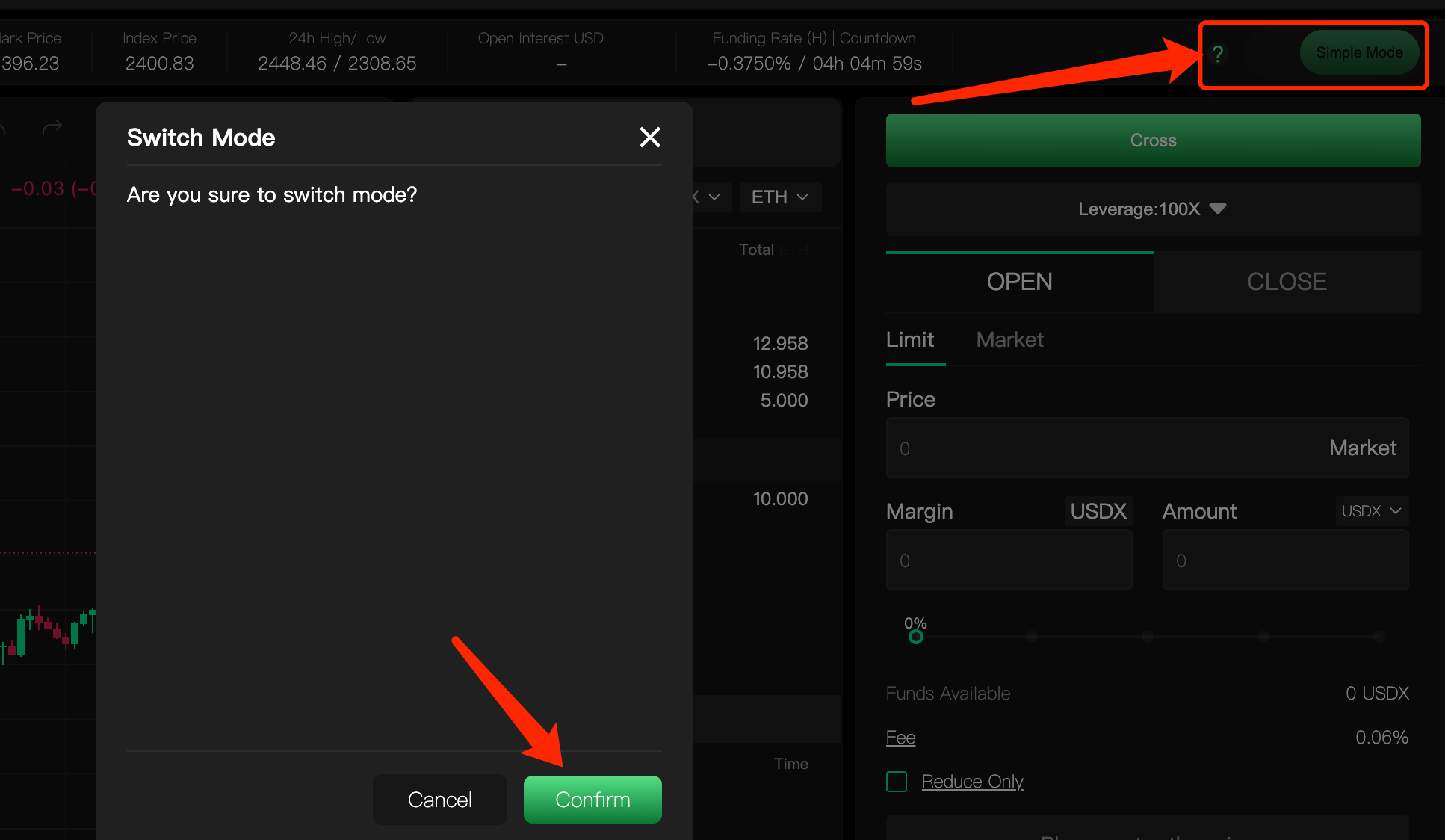 Trado Perp module supports two versions: Pro Mode, which operates on an order book system, and Simple Mode, which uses an AMM model. Users can switch modes in the top right corner of the Perp page.