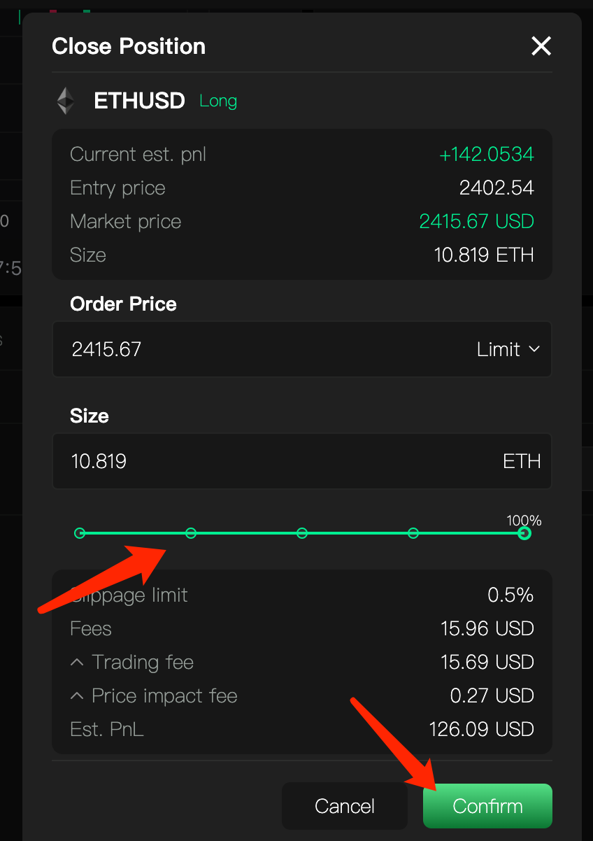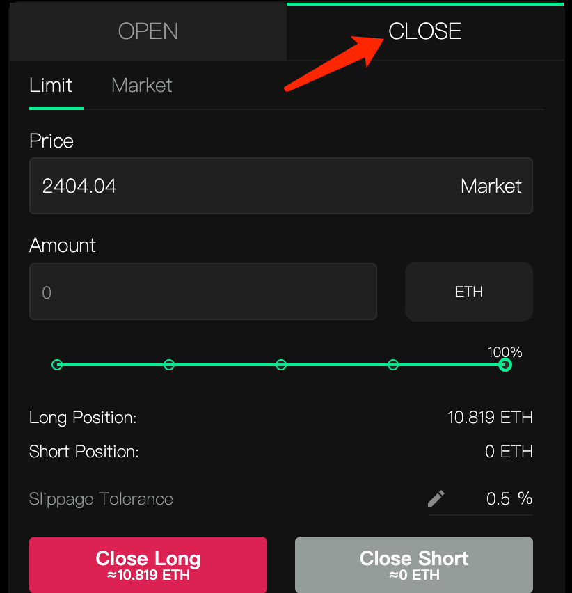 View your unclosed contract orders in "Current Positions", click "Close" button. Click "Confirm" in the pop-up modal, then confirm the transaction in your wallet to close the current order. Close All" means to close all unclosed orders.