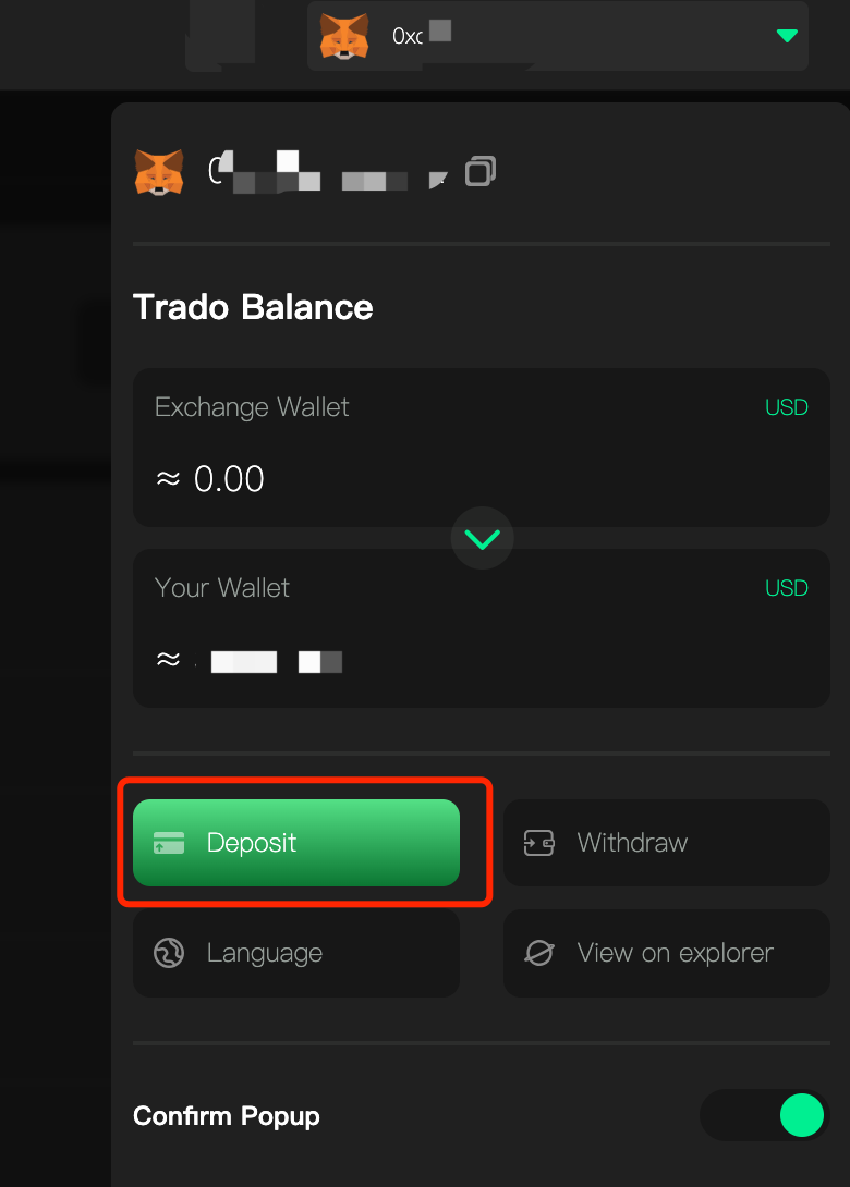 **Note:** The $USDT or $USDC deposited to the **Exchange Wallet** will automatically convert to USDX (Trado Exchange USD). You can use the funds in the Exchange Wallet for contract trading and staking. Additionally, your funds are securely held in Trado's smart contracts, and you can withdraw them to your personal wallet at any time.
