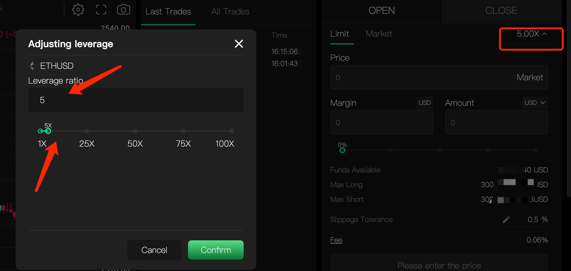 Click the multiplier number at the top right corner of the contract interface to select the leverage level. You can choose the leverage by moving the slider, or you can enter the desired leverage value directly.